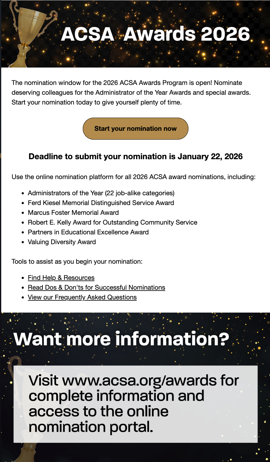 ACSA Region 16 invites members to submit nominations for the prestigious Administrator of the Year Awards across 22 job-alike categories, as well as several distinguished special awards honoring exemplary service, leadership, and commitment to equity.