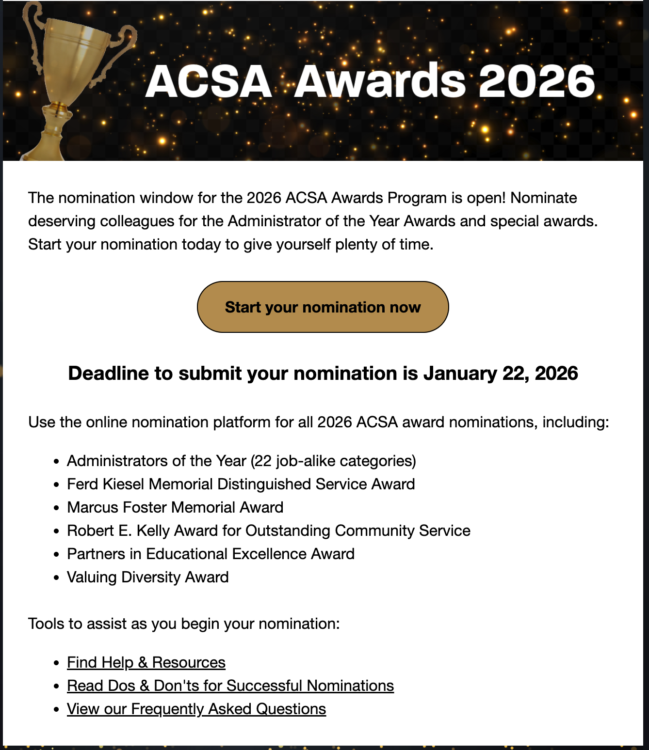 One of ACSA's priorities is to ensure that school leaders in California are recognized for their excellence. Through our annual awards program, we honor students, administrators and community organizations for their achievements and their dedication to public education at both the regional and state levels.